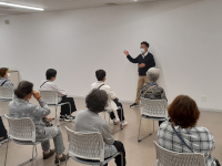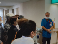 地域包括支援センターや介護老人保健施設(老健)を見学し、介護予防体操として座位で行う体操やチューブを使った体操を教えていただきました。